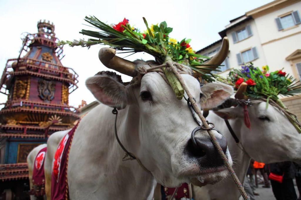 A partire dal XVII secolo, la cerimonia ha assunto la forma attuale. Il carro, custodito durante l’anno in via il Prato, viene preparato e decorato con cura per la domenica di Pasqua. I quattro buoi, simbolo di forza e purezza, lo trascinano fino al Duomo, scortati da figuranti in abiti storici che rievocano la grandezza della Repubblica Fiorentina.