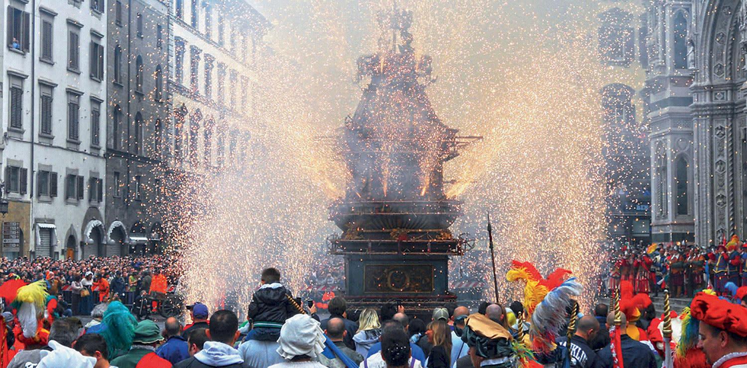 Lo Scoppio del Carro è una cerimonia religiosa con un tocco di profano: c’è teatro, c’è partecipazione popolare, c’è la spettacolarità dei fuochi d’artificio e il colore folclorico delle credenze e delle scaramanzie.