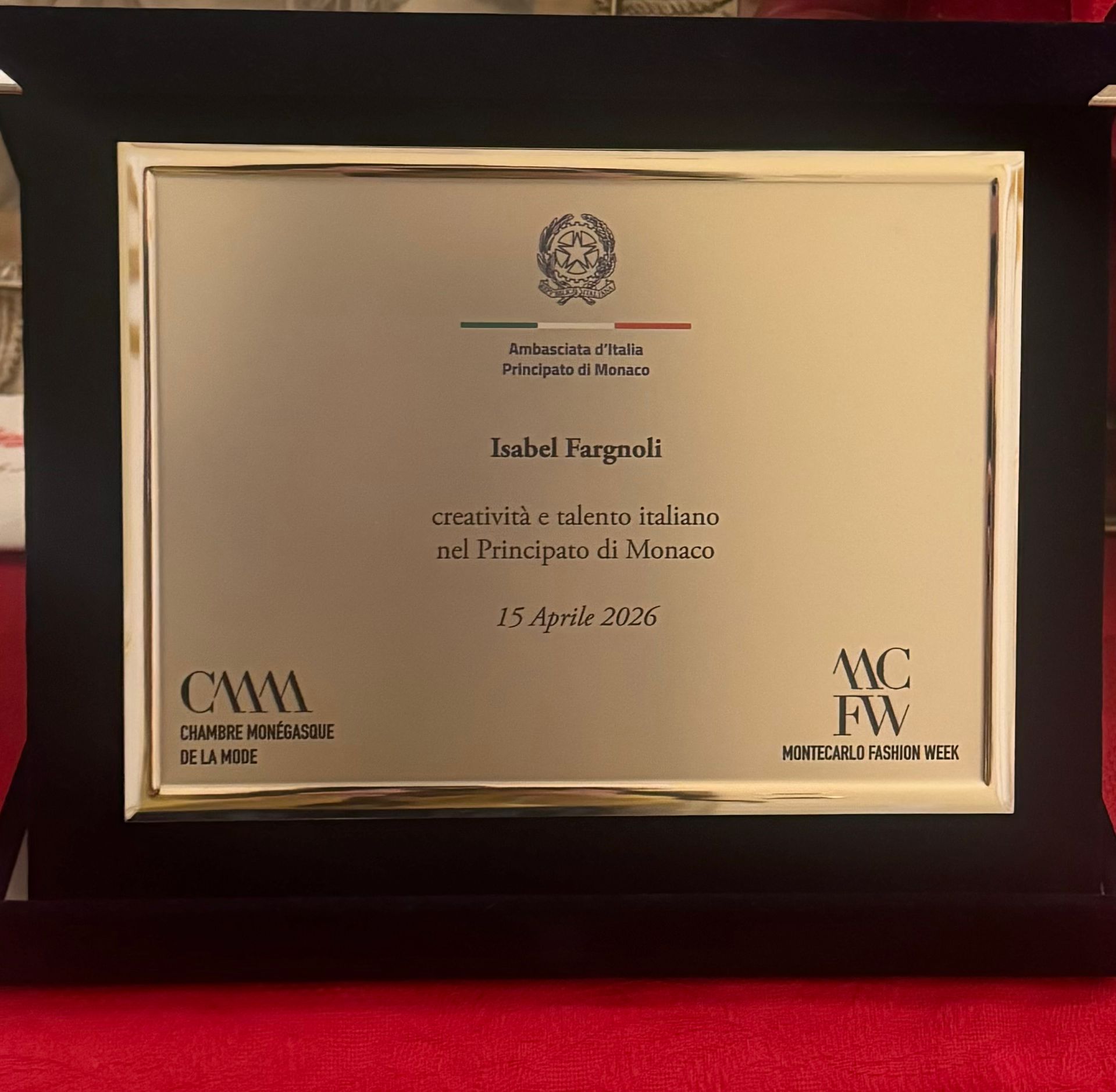 The plaque celebrates Italian creativity and talent, and receiving it was truly magical.