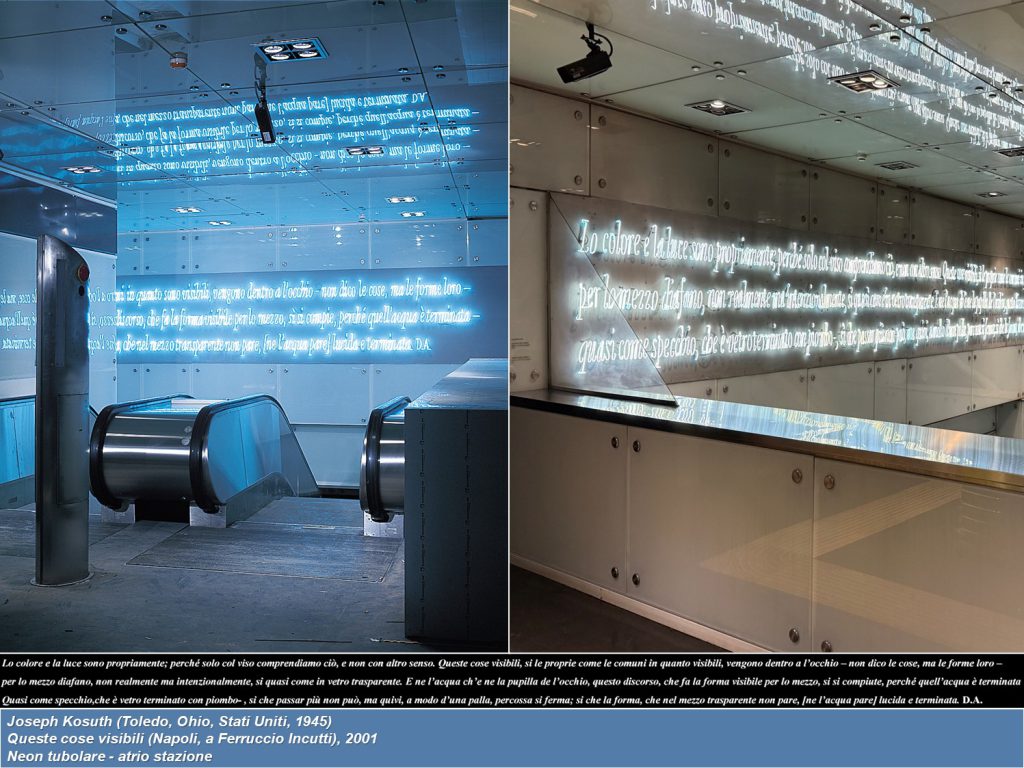 Among the most notable pieces is “Queste cose visibili”—a white neon work by Kosuth drawing on a passage from the Convivio about visual perception. Also noteworthy is Nicola De Maria’s mosaic “Universo senza bombe, regno dei fiori, 7 angeli rossi,” dedicated to his father Francesco and expressing an art that embraces the happiness of all living beings. (Ph. P. Avallone)
