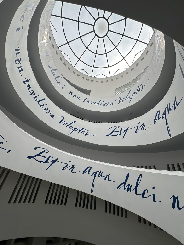 Rashid conceived the interiors as a sensory journey: at ticketing level, the Conversational profile pillars (2010) depict emblematic faces of human dialogue, while Synapsi (2010)—an aluminum sculpture crafted by Corrado Tamborra—represents neural connections.