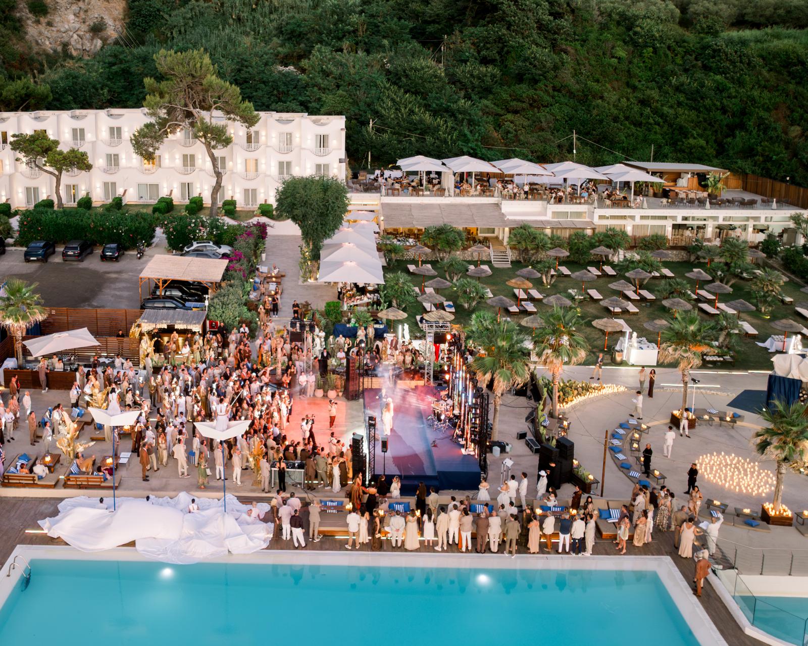 L’evento, curato dall’agenzia Cira Lombardo, ha accolto ospiti provenienti da tutta Italia e dall’estero: imprenditori, diplomatici, politici e artisti, giunti via terra e via mare, attraccando direttamente al molo privato del Maya, location che ha ospitato la settimana precedente il matrimonio di Matteo Politano.