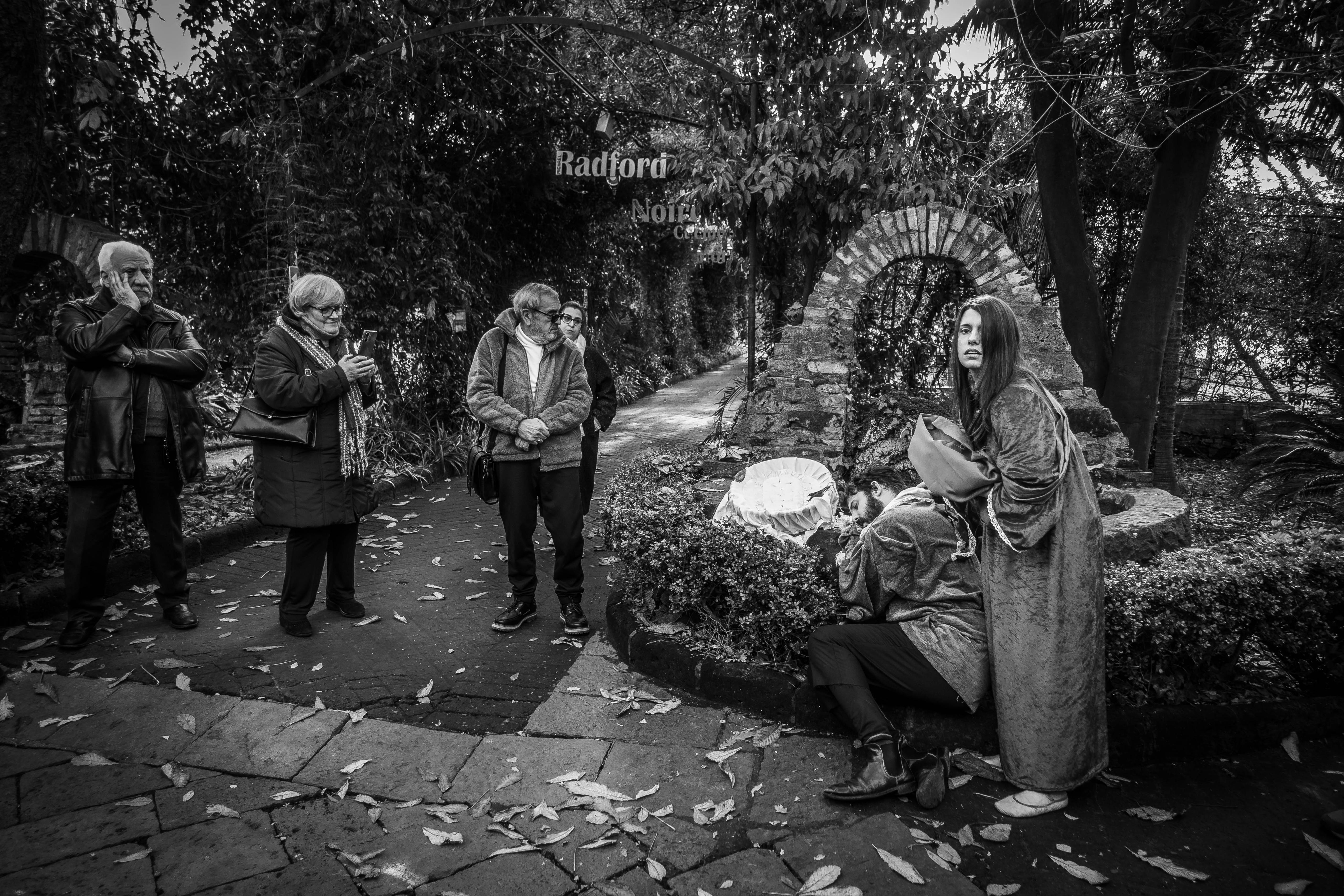 “Te piace ’o presepe?” è uno spettacolo itinerante. Il pubblico viene accolto sul sagrato e accompagnato all’interno dagli attori, seguendo un percorso che attraversa le figure del presepe. Le scene non si concentrano su un unico palco, ma si attivano in diversi punti della chiesa. Lo spazio diventa drammaturgia viva, senza forzature e nel rispetto delle funzioni del luogo. Non c’è separazione netta tra chi guarda e chi agisce: lo spettatore è parte del movimento, quasi come se fosse anch’egli un pastore del presepe che osserva quel che gli accade attorno.